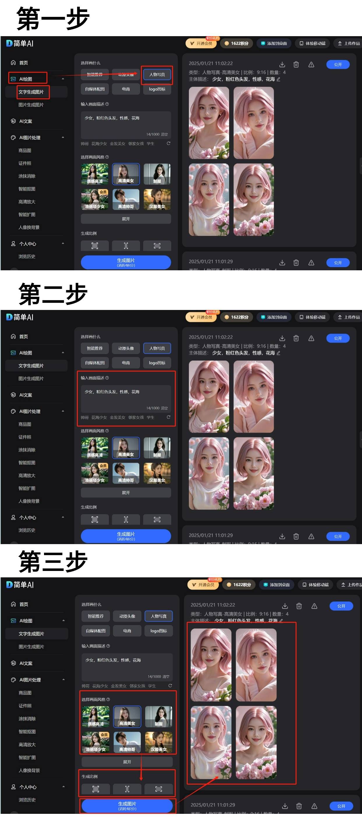 第一步:我们在电脑或手机浏览器中打开简单AI,或者在微信小程序搜索【简单AI】。在左侧导航栏选择AI绘图中的文字生成图片★,在选择画什么模块选择人物写真
