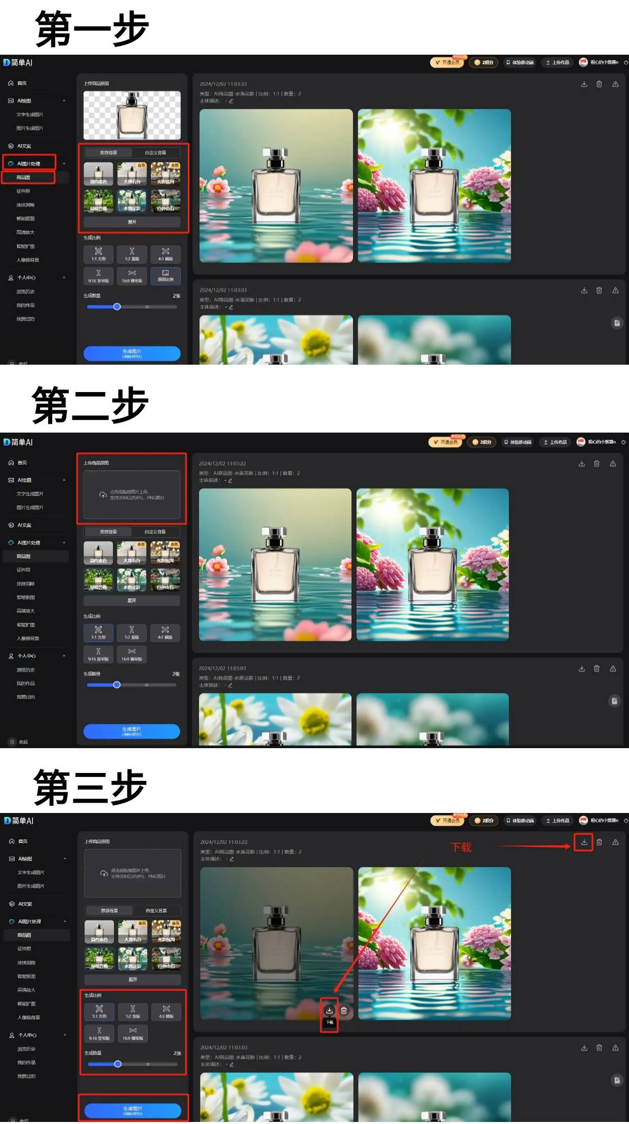 第三步:选择生成比例及生成数量★,点击“生成图片”,一键换背景★!点击下载图标,就可以免费下载啦~你可以将这些图片用于淘宝主图★★、视频封面、海报制作等各种电商场景中,吸引更多的顾客关注。