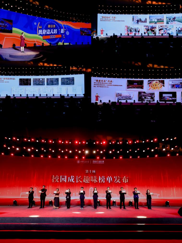 在趣味成长榜单发布环节,由讲述同学介绍了她身边的“最”,例如最美笔记、跑步最多、学业进步最大、书籍借阅最多、学业辅导等志愿服务工时最多、参与劳育课程最多等,讲述了一个个身边同学的成长故事,鼓励同学们“因为热爱,做到极致,这就是坚持”。