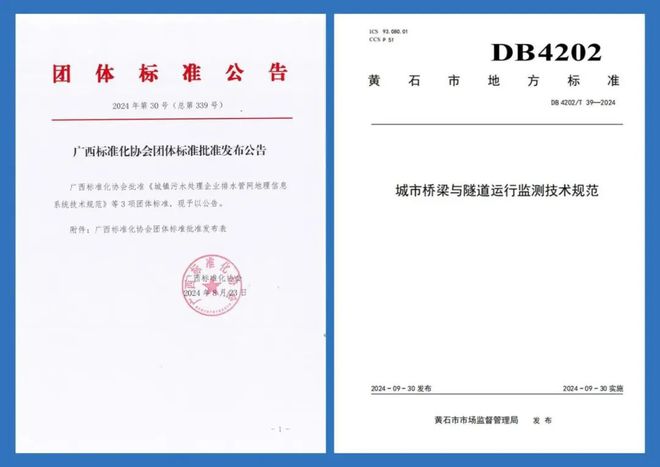 ▲参编广西标准化协会《城镇污水处理企业排水管网地理信息系统技术规范》和黄石市城市管理执法委员会《城市桥梁与隧道运行监测技术规范》正式发布。