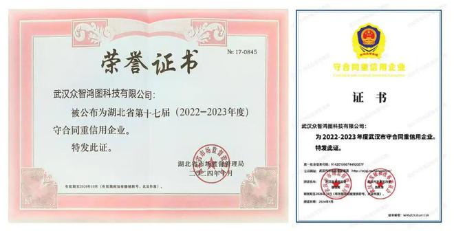 ▲连续多年获评湖北省/武汉市“守合同重信用企业★”荣誉,是湖北省/武汉市市场监督管理局对众智鸿图长期坚守诚信经营、积极履行社会责任的高度认可与鼓励。