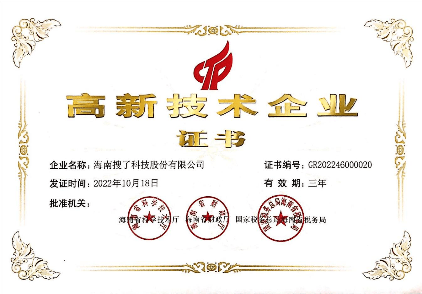 2022年10月★,海南搜了科技股份有限公司被评为海南“高新技术企业”★。