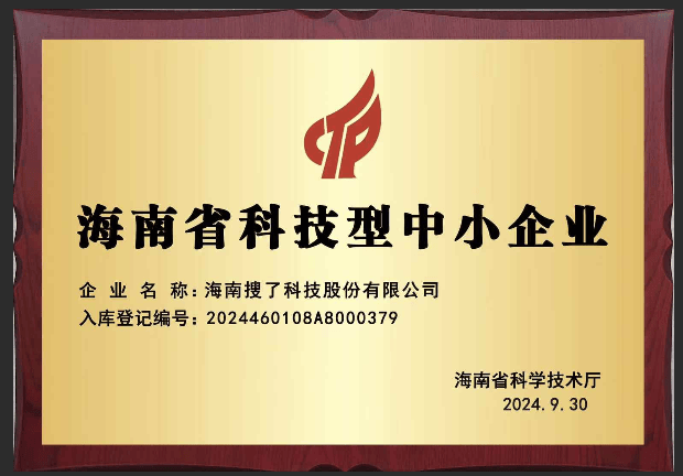 2024年9月30日★,海南搜了科技股份有限公司被海南科学技术厅评定为省级科技型中小企业★。