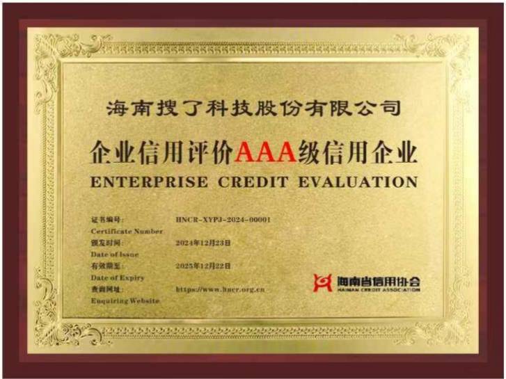 2024年12月23日,海南省信用协会授予海南搜了科技股份有限公司企业信用评价3A级信用企业